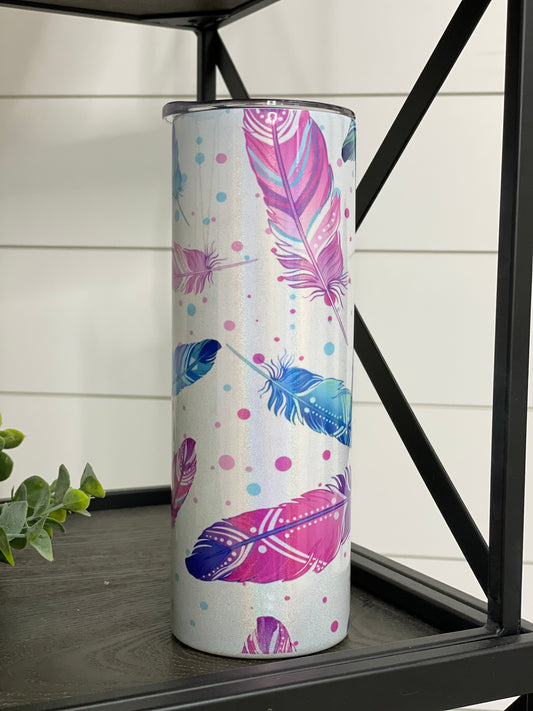 Water Color Feathers 20oz Shimmer Skinny Tumbler